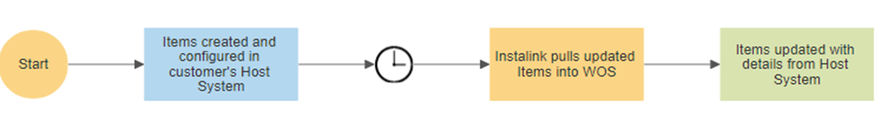 Downloading items into WOS is a basic integration that is included in almost all projects. A typical item download flow is simple and represented by the flow below. The Host system is checked for items that have been updated. These details are then pulled into WOS to either update existing or create new items.