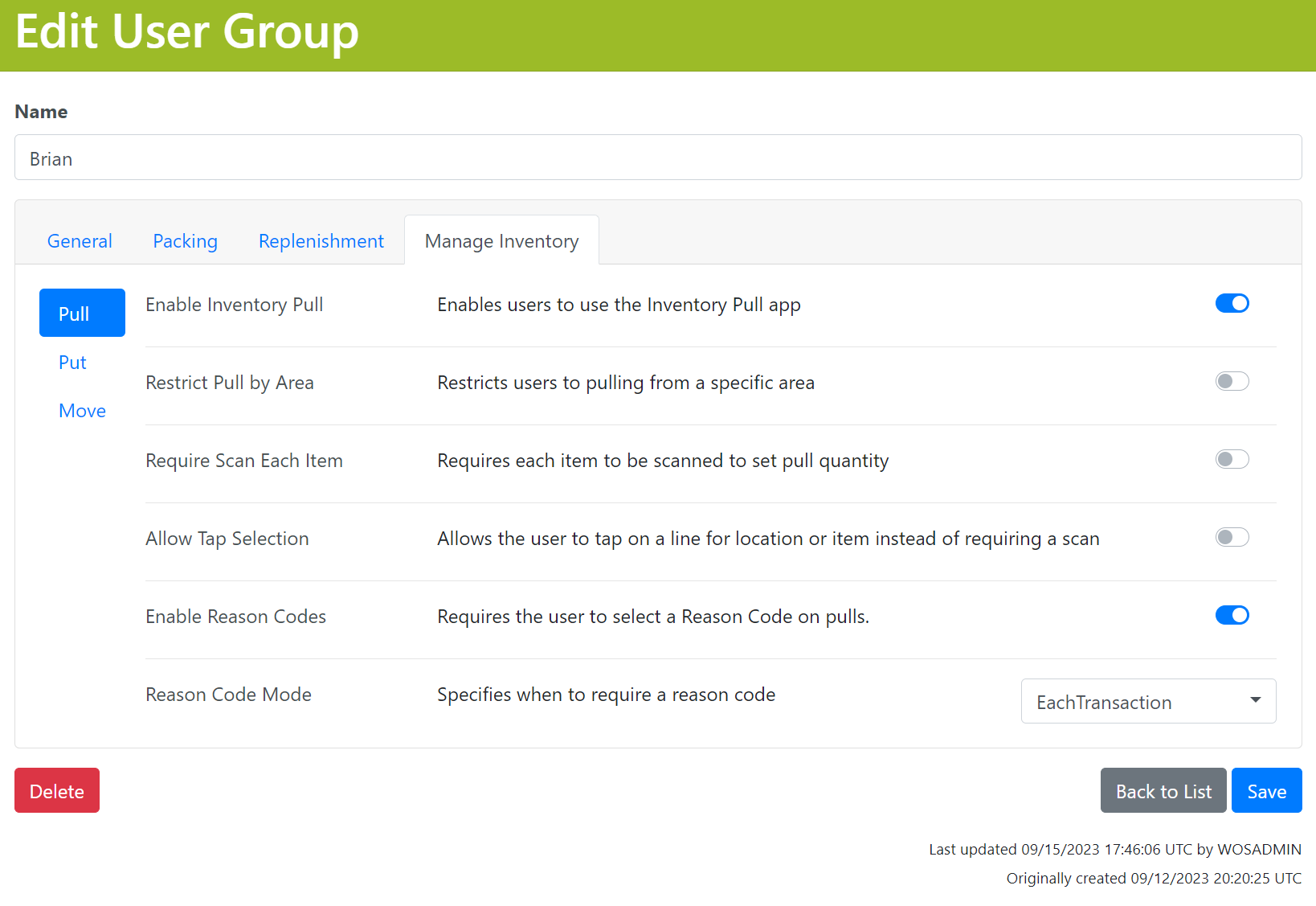 • Moves by Area - Group Settings already allowed a separation of restricting moves by Area from other transactions. But it didn't allow more granular settings to allow some Users to Put into an Area without also being able to Pull from an Area.