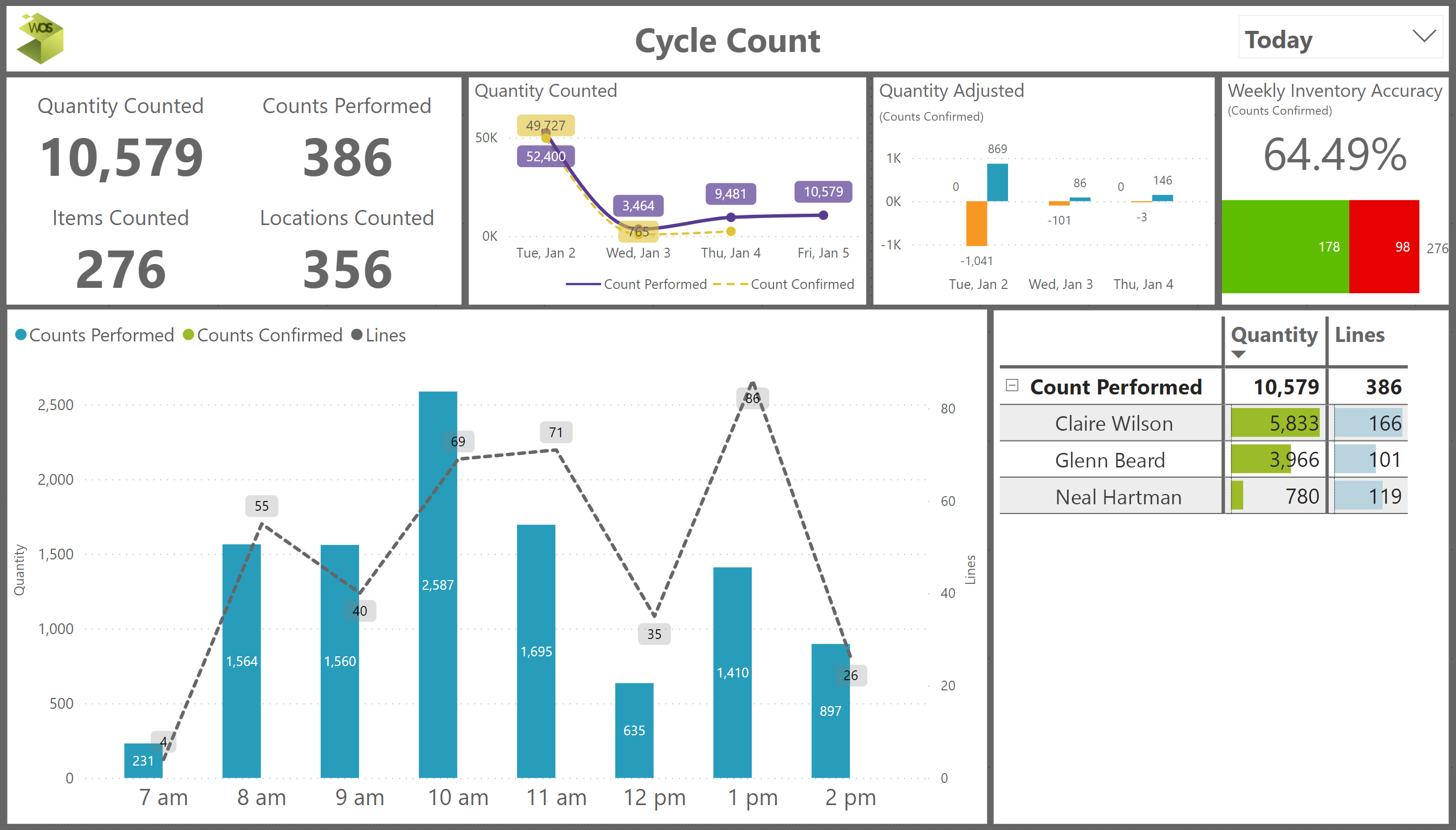 - Hourly counts, daily values, and user metrics are provided for cycle counts performed and confirmed