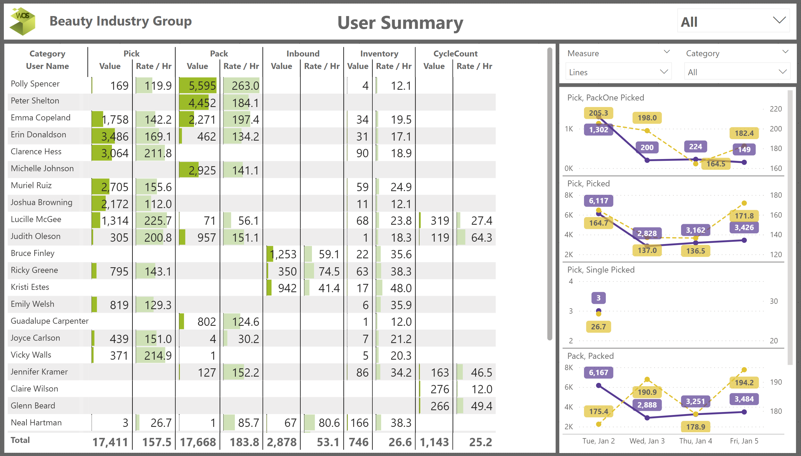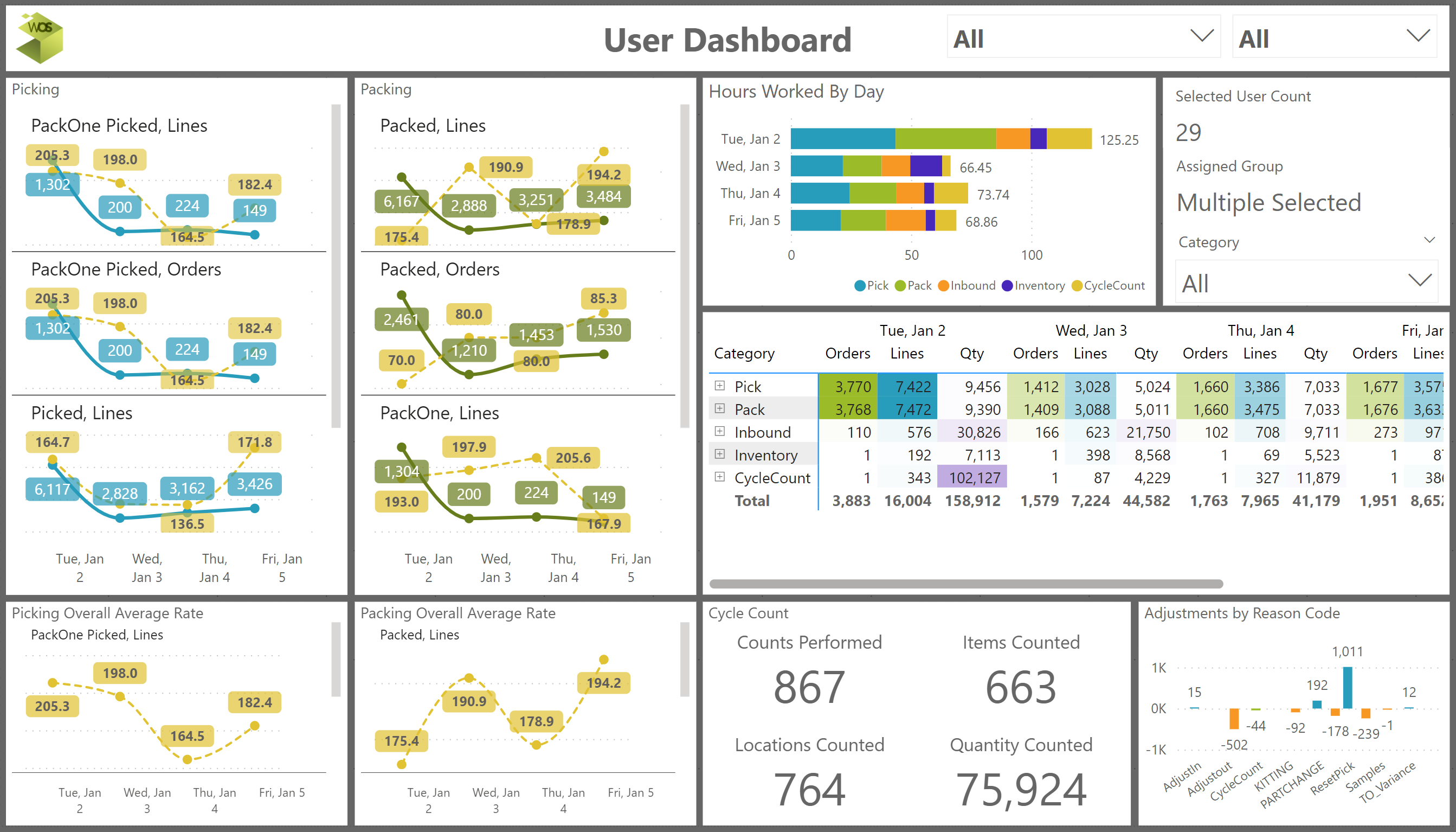 - Two separate pages focus on the picking and packing operations including overall and user specific metrics