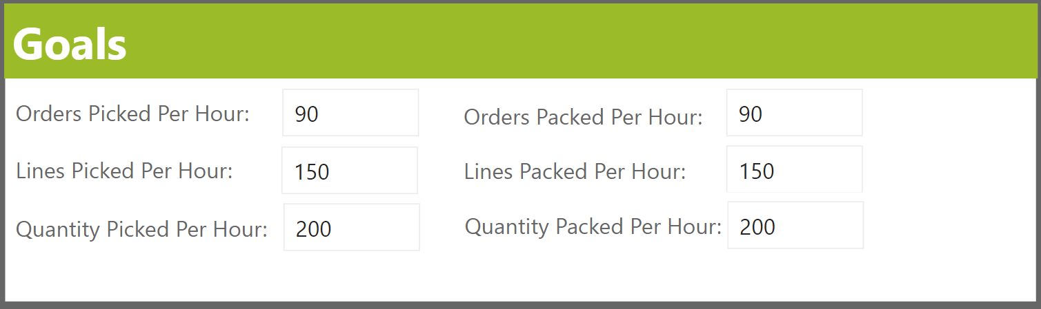 - The Outbound and Pick and Pack Performance pages provide the ability to show progress towards a goal. These goals can be set from the Home page.