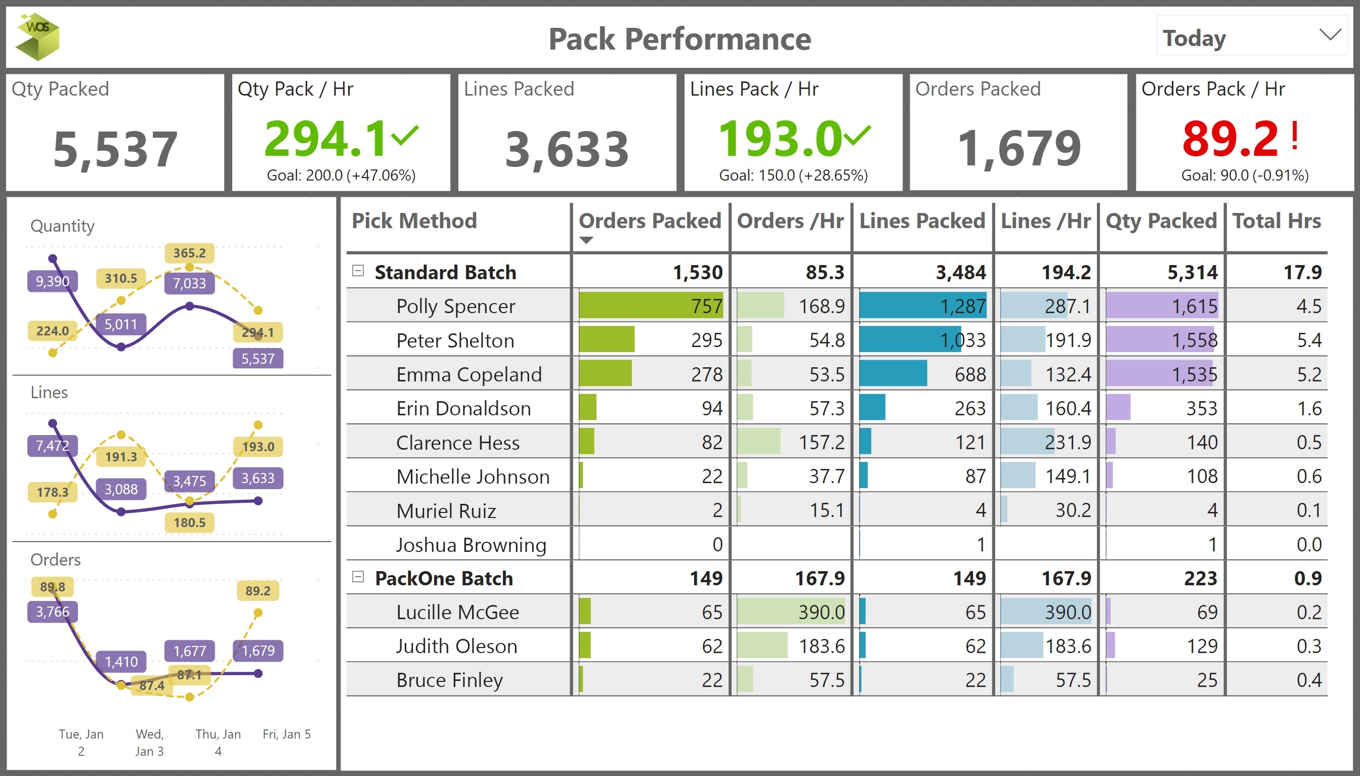 - Hourly progress and daily values are provided for both orders Picked and Packed